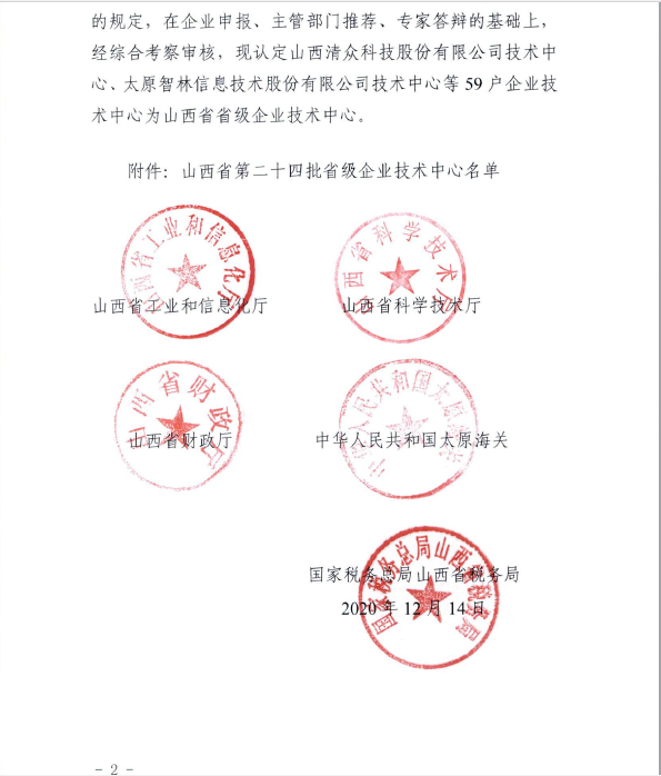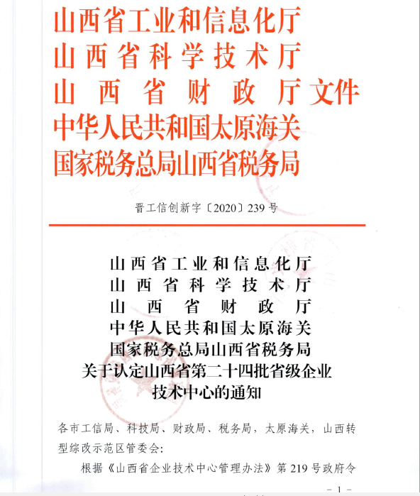 山西千岫制藥有限公司技術(shù)中心于2020年12月14日被省工信廳、省科技廳、省財政廳、中華人民共和國太原海關(guān)、國家稅務(wù)總局山西省稅務(wù)局等5個部門聯(lián)合認(rèn)定為山西省第二十四批省級企業(yè)技術(shù)中心。
